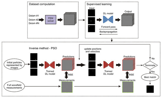 It should be noted that the PSO algorithm was used in the inverse method due to its efficiency in handling more general formulations of objective functions (as opposed to stricter algebraic constructs), but other algorithms can be used as well. On one hand, the inputs are initial particles represented by binary images in Figure 1. These are fed to the trained DL model, which, in turn, is predicting the full wavefield of propagating waves for respective delamination scenarios. On the other hand, full wavefield measurements are acquired. An objective function is built upon the computation of the mean square error (MSE) between the predicted wavefield and the measured wavefield. Next, the particle positions and their velocities are updated accordingly until the termination criterion is met. Finally, the identified delamination is visualised for the best match. It should be added that the proposed method was validated on synthetic data only.