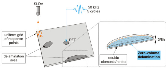 Numerical and experimental setup showing the types of possible delaminations (embedded and opened at the edge), piezoelectric transducer (PZT), and scanning laser Doppler vibrometer (SLDV).