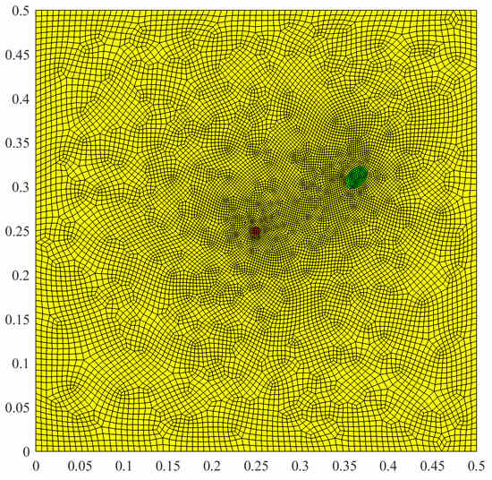 An embedded MATLAB function was used for randomisation. However, the coordinates of the centre of delamination very close to the PZT were excluded. It should be added that two types of delamination, as shown in Figure 2, were possible, namely fully embedded or opened at the edge. The delamination modelling was realised by writing custom geometry files, which were used to generate an unstructured mesh consisting of quadrilateral elements by using GMSH software [32] (one mesh per delamination scenario). An exemplary mesh of quadrilateral elements is shown in Figure 3 in which the green elements highlight the delamination, whereas the red elements represent the location of the piezoelectric actuator. Next, the mesh was modified by doubling elements and splitting nodes at the delamination region. This resulted in the so-called zero-volume delamination. Next, the quadrilateral elements were converted to 36-node spectral elements by using a custom MATLAB script. The wave propagation problem was solved using an in-house code of the time domain SEM, which was run on the GPU. The obtained animations of the propagating guided waves were converted to images (frames).