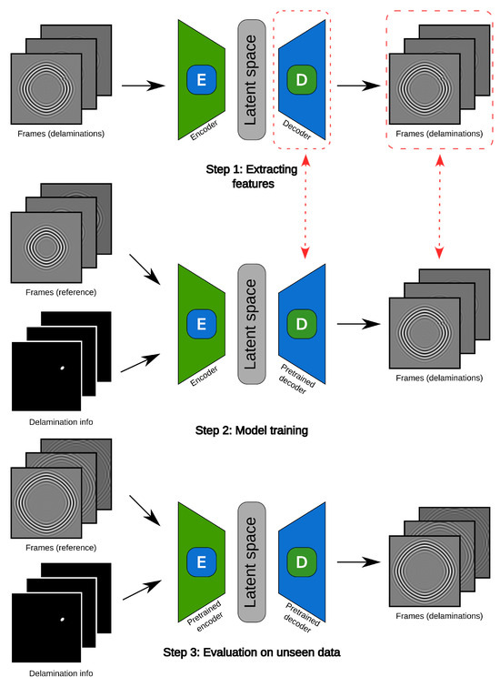 - Model training: In this step, the actual model training is carried out. The full wavefield frames in a plate without delamination, along with the binary image of the respective delamination case, are fed into the DL model for training. The features extracted from encoder part of the first step are used as labels in this step, as shown in Figure 4.