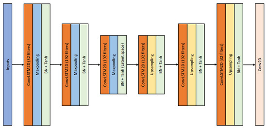 The proposed ConvLSTM autoencoder model takes 32 frames as input concatenated with a binary image, which is replicated 32 times (see Figure 4). The DL model consists of six ConvLSTM layers (see Figure 5). The first ConvLSTM layer has 32 filters, the second and third layers have 192 filters, the fourth layer has 32 filters, and the last two ConvLSTM layers have 192 filters. The kernel size of the ConvLSTM layers was set to () with a stride of . The padding was set to “same”, which makes the output the same as the input in the case of stride 1. Furthermore, a tanh (the hyperbolic tangent) activation function was used within the ConvLSTM layers that output values in a range between ( and 1). Maxpooling and upsampling were applied at each ConvLSTM layer for reducing the size of the features and the reconstruction purposes, respectively. Moreover, a batch normalisation technique [34] was applied at each of the ConvLSTM layers. At the final output layer, a 2D convolutional layer followed by a sigmoid activation function were applied.