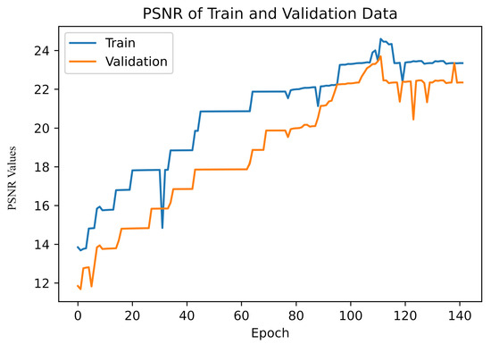 The peak signal-to-noise ratio (PSNR) metric values as a function of the epoch is shown in Figure 6. During both training and validation, these metrics converged. Moreover, the validation curve was slightly below the training curve, which indicates that overfitting did not occur.