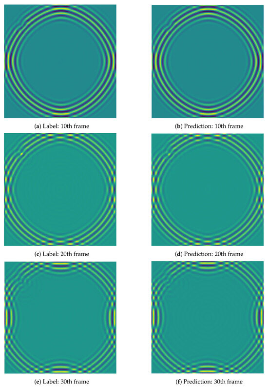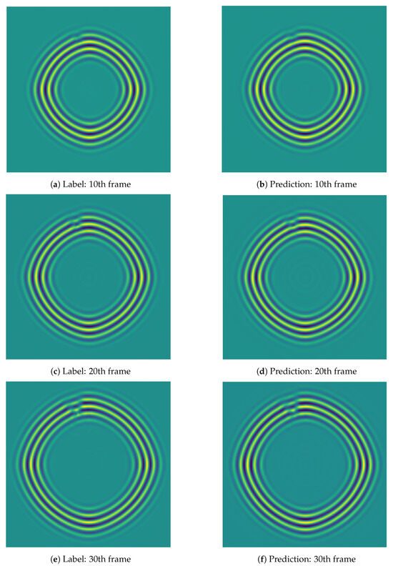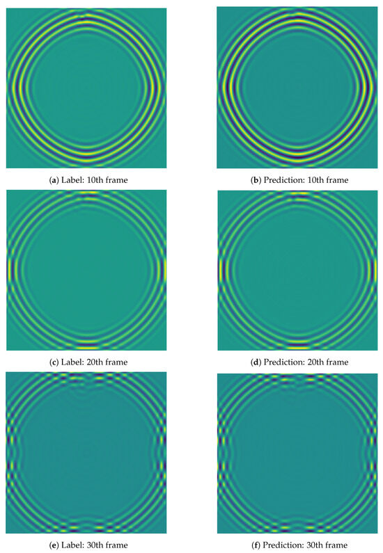 Three different representative cases were selected from the numerical dataset to show the performance of the developed DL model. Figure 7, Figure 8 and Figure 9 show three different frames from three selected numerical test cases. The frames on the left column represent the labels to which the prediction of the proposed DL model is compared. The frames on the right column represent the prediction using the DL model. Particular frames were selected to show the interaction of the propagating Lamb waves with the delamination, namely the 10th, 20th, and 30th frames after the interaction with the delamination. These frame numbers were easily extracted knowing the A0 mode velocity and the modelled delamination location.