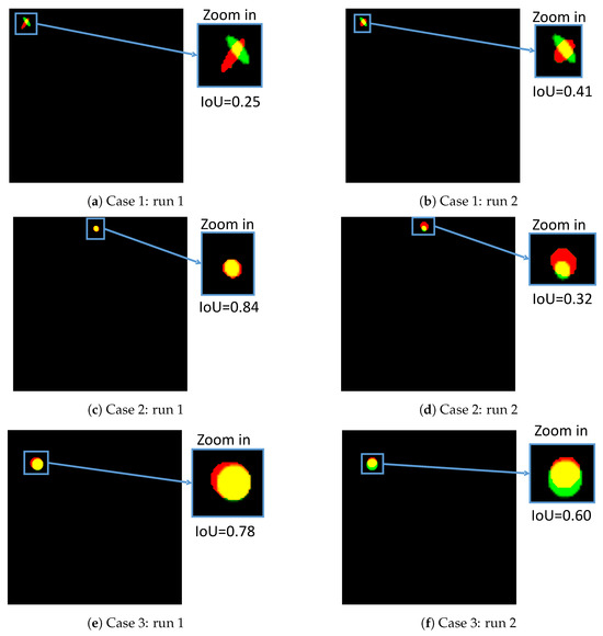 Actually, the damage identification difficulty level is reflected in the obtained IoU values, which are shown in the zoomed-in regions around the delamination in Figure 10. On average, the lowest IoU values were obtained for case 1.