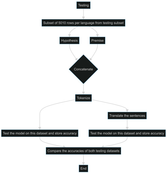 Figure 2 represents the steps taken while testing the model on our data. We first concatenate the hypothesis and premise, just like in the training data. Then, we create two sets of data by translating the sentences before testing. After testing, we compared the metrics of the two subsets of data.