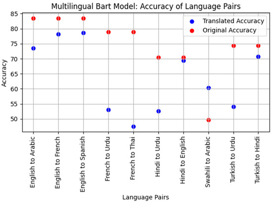 mBART performs well with English–French and English–Spanish language pairs, with excellent accuracy scores for both the original and translated F1. Other language combinations, such as Turkish–Urdu and Hindi–Urdu, score lower.