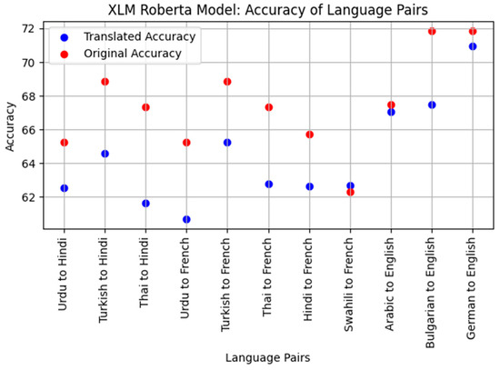 Based on the Urdu–Hindi language pair, the accuracy scores of the XLM-Roberta model are 0.65220 and 0.62188, respectively. In the Urdu–French language pair, accuracy ratings are lower, with original and translated F1 scores of 0.65220 and 0.59863, respectively.