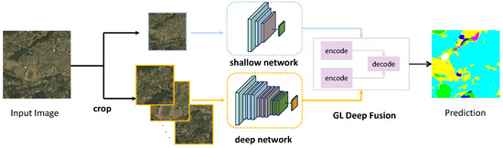 Overview of GLSNet. The global shallow branch and local deep branch use shallow neural networks and deep neural networks to capture global contextual information and local detail. Then, the GL-Deep Fusion completes the fusion of global–local information, ultimately completing the segmentation task of ultra-high resolution images.