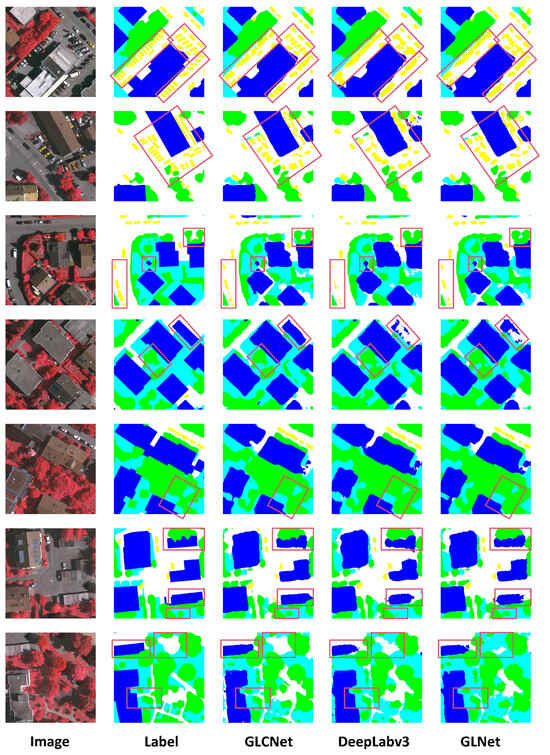 The segmentation outputs of various common techniques exhibit distinct patterns when visualized in the Vaihingen dataset. As shown in Figure 5, in the DeepLabv3 and GLNet, there are problems where large independent areas cannot be accurately segmented due to interference from boundary details. In contrast, GLSNet excels in choosing segmentation boundaries. For the stacking of small target objects, GLSNet has proven to be more precise in segmenting these objects compared to GLNet and DeepLabv3.