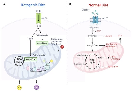 Scheme of cell during ketogenic diet vs normal diet: (A) Increase in ketone body level as a result of fatty acid oxidation, thus enhancing level of acetyl-CoA in mitochondria to compensate for the ATP needed. (B) Glucose is fully oxidized through glycolysis followed by the mitochondrial Krebs cycle coupled to oxidative phosphorylation. Created with BioRender.