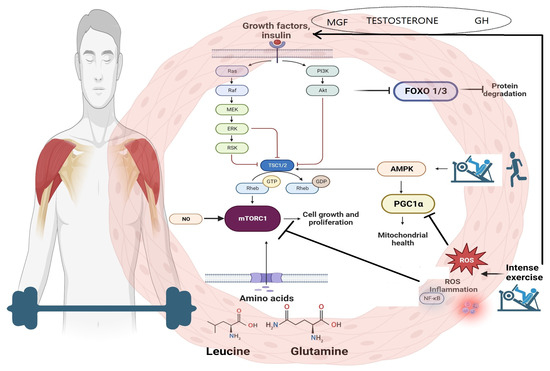 The musculoskeletal system represents a unique structure in which bones, muscles, ligaments, soft tissues, and tendons are intricately interconnected [52] and coordinated by neuromuscular junctions [53]. As a type of strength training, resistance exercise is characterized by the physical effort exerted when skeletal muscles work against a given weight or external force. Numerous positive health and physical performance adaptations have been reported when the stressful stimulus of resistance exercise is administered with appropriate time intervals and optimal recovery time in different phenotypes [54,55,56,57,58,59]. This remarkable plasticity is responsible for adaptations in physiological and pathophysiological conditions [60,61,62,63]. This ability of muscles to adapt to external stimuli relies on different signaling pathways and secondary messengers, which are responsible for maintaining muscle status. The concept of muscle status is encouraged, given that it encompasses not only quantity (skeletal muscle mass) but also gives relevance to intramuscular structural features (muscle quality), endocrine activity (insulin), and movement functionality. In particular, the mechanistic Target of Rapamycin complex 1 (mTORC1) pathway [52], strongly activated by insulin, and the mitogen-activated protein kinase (MAPK) pathway [64] seem to play an essential role in resistance exercise-induced adaptations of musculoskeletal tissue.