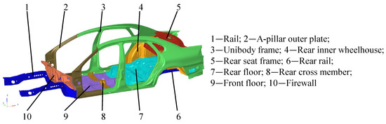 The bending and torsional stiffness of the BIW have an important impact on vehicle performance, such as NVH (noise, vibration, and harshness), safety, handling performance and stability. They also affect the degree of lightweighting of the body, which are key parameters in the development process and represent the core competitiveness of the vehicle. The model is from ref. [23], and the pre-processing process of CAE meshing, material properties and constraint boundaries of the model is performed using Hypermesh (version 2019) software, which has about 390,000 cells. The thicknesses of 14 key sheet metal components are considered as the design variables. The FEM and component numbers are shown in Figure 1. The paired components in Figure 1 are annotated on only one side, and the initial values and ranges of the design variables are shown in Table 1.