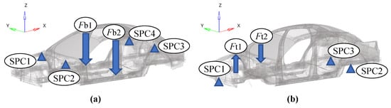 The loads and constraints for the bending and torsion cases are shown in Figure 2a and Figure 2b, respectively, defining the vertical (gravitational) direction of the model as the Z-direction. The forces applied to the sill beams and applied to the shock towers are Z-directed forces (N): and . For bending conditions, the four restraint positions (SPC1-SPC4) are located on the shock towers; for torsion conditions, the front restraint position (SPC1) is located in the middle of the front bumper frame, and the rear restraint positions (SPC2, SPC3) are located on the antiroll bar brackets.
