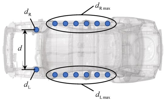 The locations of the observation points are illustrated in Figure 3. Under the bending condition, the maximum deformation (mm) in the Z-direction of the nodes below the left and right sill beams (six observation points are found uniformly on each side) are set to be and , respectively, and, under the torsion condition, the Z-displacements (mm) at the left and right loading points of the shock towers are and , respectively. Setting d as the distance (mm) between the loading points of the shock towers, the equations of bending stiffness and torsional stiffness can be obtained: