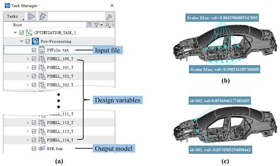 The ANSA pre-processing requires the execution of a script (.script.ansa), which can be created through the “Task Manager” of ANSA. Select “Optimisation Task” in “Task Manager” to set up the pre-processing procedure, as shown in Figure 4a, including input parameter file (DVFile.txt), design variables and output model (BIW.fem), and then save the current operation as execution script (.script.ansa), which automatically assigns the parameters of DVFile.txt to the design variables of the model and exports the modified model (BIW.fem).
