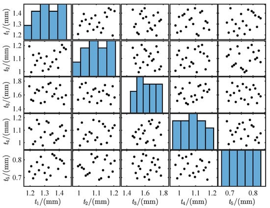 BIW involves 14 variables; thus, each sample dimension is 14. In order to make the sample distribution more uniform, this study adopts the Latin hypercube method for sampling, and the initial sample size is set to 20. Figure 6 displays matrix plots of the five variables from to ; the diagonal histograms show that the samples are evenly distributed, and the remaining scatter plots show that the samples are distributed in the entire design space without evidence of multi-sample clustering.