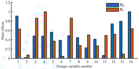 When the DOE is completed, the main effect values of the 14 design variables on the bending and torsional stiffness responses ( and ) are calculated and normalized. The results are shown in Figure 7: each variable exhibits a different degree of influence on and . Taken together, it is observed that only has a smaller effect on both responses, but, for , has more influence than . Therefore, all 14 variables are considered in the next step of reliability analysis.