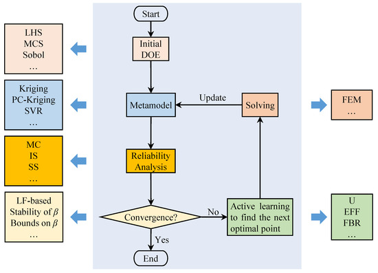 On the other hand, metamodeling methods are used for reliability analysis. For complex engineering problems, there may be complex nonlinear relationships between the design variables and the responses, which are not explicitly expressed and are black-box problems, or the performance (limit state) functions involve expensive computational problems. Therefore, metamodeling methods are used in practical engineering, and the basic idea is to construct approximate (surrogate) models, i.e., to establish approximate mapping relationships between input variables and output responses by DOE, which play a role in computationally efficient and predictable responses at unknown points. Commonly used surrogate models include the response surface model [8], polynomial chaos expansions (PCEs) [9], kriging [10,11], polynomial chaos–kriging (PCK) [12], machine learning [13,14], support vector machines [15,16] and radial-basis functions [17]. Once the surrogate model has been constructed, reliability methods can be used to calculate the failure probability.