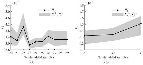 The iterative process based on bounds on is shown in Figure 10. The initial sample size is still 20; after adding 47 new samples, the metamodel of torsional stiffness reaches convergence, and, using these 67 samples as the initial samples to update the metamodel of bending stiffness, as can be seen from Figure 10b, the accurate metamodel is established with only 1 new sample.