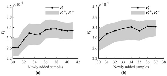 This means that the probability of any point in the candidate pool being misclassified is less than . In general, is acceptable. The convergence criteria also include variance-based criteria (bounds on , bounds on ) and stability-based criteria (stability on , stability on ), where and denote the failure probability and the reliability index. Taking bounds on as an example, the expression is as follows: