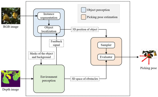 The object–environment fusion visual system is schematically shown in Figure 1. The system consists of three modules: object perception, environmental perception, and picking pose estimation. Object perception includes instance segmentation and object localization; picking pose estimation involves the sampler and evaluator. Object perception is responsible for identifying and locating objects, which provides the mask of the object and background for environmental perception, as well as the 3D position of the object for picking pose estimation. Environmental perception plays a role in analyzing the 3D space of the objects and obstacles. It provides the feedback signal and the 3D space of the obstacles for object perception and picking pose estimation, respectively. Picking pose estimation combines the information of the objects and environment to generate a set of collision-free picking poses.