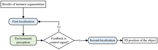 In Figure 1, object localization includes first localization and second localization. In the stage of objects’ first localization, it is responsible for obtaining the masks of the object and background based on the results of instance segmentation. The masks of the object and background are provided to the environmental perception module to distinguish the 3D space of the object and obstacles. However, the integrity of the depth data is compromised by the varying illumination, which may result in the depth being zero or infinite. As shown in Figure 2, when environmental perception fails to obtain the normal depth of the object, a request signal should be fed back to the object perception module. It requests the re-initiation of object first localization to replace the masks of other objects until the object’s depth is successfully perceived. Afterwards, we proceed to calculate the distribution of the obstacles in the background. Concurrently, it feeds back the control signal to the object perception module, which means supplying the point cloud of the object for the completion of second localization.