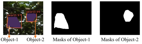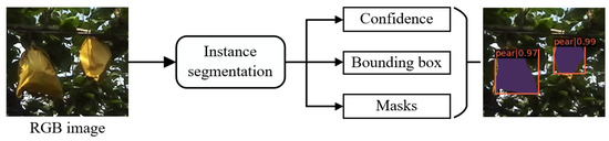 In this section, instance segmentation is applied to identify all pears in an RGB image, which generates the confidence, bounding box, and masks for each instance, as shown in Figure 3. We aim to calculate the 3D space of the pear as accurately as possible. In this case, instance segmentation provides more detailed information, since each bounding box only includes the pixels of the object, whereas other bounding boxes additionally contain the pixels of other objects.