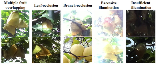 The visual system provides inputs and constraints for hand–eye calibration and path planning, and this plays a significant role in automatic fruit harvesting [3]. The visual system usually consists of one or more tasks of object perception, environmental perception, and picking pose estimation [4,5,6,7]. However, most visual systems only focus on a single task. For example, they only recognize fruits [8,9] in the field. Moreover, it faces complex environmental conditions, such as the occlusion of branches and leaves and uneven illumination [10,11]. These problems can cause picking failure and affect its practicability. Therefore, this paper comprehensively analyzes a visual system for automatic fruit picking.
