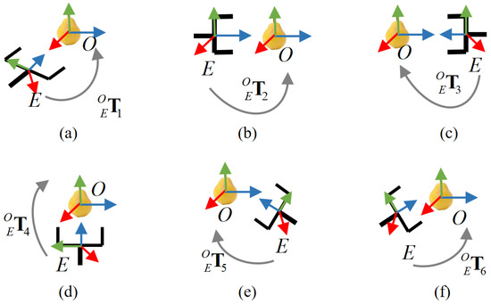 To calculate the picking pose for the object, we require the transformation of three coordinate frames: object frame O, camera frame C, and gripper frame E. As shown in Figure 7, the transformation relationships are as follows.