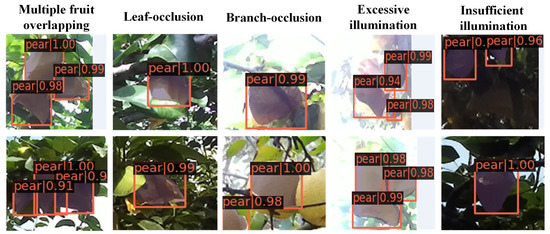 Table 2 shows the comparison of the different networks in the S2 dataset under the conditions of multiple fruit overlaps, branch occlusion, leaf occlusion, excessive illumination, and insufficient illumination. It can be observed that the AP(Bbox) and AP(Mask) of all networks decreased, with the most obvious decline under the condition of insufficient illumination. Figure 11, Figure 12, Figure 13 and Figure 14 display the experimental results of Mask R-CNN(Swin Tiny), YOLOv5, YOLOV8, and Mask R-CNN(ResNet-50) under the different conditions. It can be seen that Mask R-CNN(Swin Tiny) was capable of effectively addressing the problems of occlusion and illumination. However, YOLOv5, YOLOv8, and Mask R-CNN(ResNet-50) exhibited a higher rate of missed detection and incomplete segmentation.