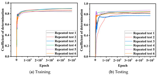 The number of iterations, serving as a special hyperparameter, is also tested, as shown in Figure 1. In MAML, an epoch refers to the number of iterations as well as the operation number of the entire training and testing dataset. To achieve the best results, it is essential to properly set the maximum number of epochs. In this study, epochs in the range of 0 to 5000 are selected. As the R-squared value approaches 1.0, indicating better prediction results, it is evident that, with increasing training epochs, both during the training and testing processes, the predicted results converge to higher values, around 0.8. As depicted in Figure 1a, the convergence speed during the training process is notably rapid. In the initial iterations, the predicted values quickly approach the true value, reaching an R-squared value of approximately 0.8 at around 300 iterations. Subsequently, the convergence rate slows down, with a slight increase in the R-squared value, nearing stability around 1000 iterations. The subsequent trend suggests that the value will eventually approach 1.0; however, this would require significantly increased costs. In Figure 1b, the evolution curve of R-squared values during the testing process and with increasing iterations is illustrated. It is noticeable that there is a notable distinction between the testing and training processes. While some individual tests still exhibit a rapid convergence speed consistent with the training process and their R-squared values are initially high, the convergence speed of tests 1, 2, and 3 significantly decreases. Although the results of these tests converge by the 1000th iteration, their R-squared values slightly decrease, stabilizing between 0.75 and 0.82. This occurrence is likely due to the disparity in the amount of data used between the training and testing processes. Therefore, the final convergence results may be biased, but the primary objective of achieving rapid convergence while maintaining prediction accuracy on a small-sample database has been accomplished.
