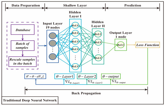 In recent years, with the increasing application of deep learning in various engineering fields, there has been a growing number of cases where scholars in the field of civil engineering tend to use traditional ANN models, namely, backward propagation algorithms, for implicit regression problems. As shown in Figure 2, traditional neural networks are mainly divided into two groups: forward propagation and backward propagation. During forward propagation, with m training samples available, where X represents input variables and y represents output results, these m samples can be represented as . Input variable X is represented as an m × nx matrix, where m denotes the number of training samples and nx represents the dimensionality of the input feature vectors. Similarly, output variable y is represented as an m × ny matrix, with m denoting the number of training samples and ny representing the dimensionality of the output feature vectors. The above is the preparation of the dataset before training.
