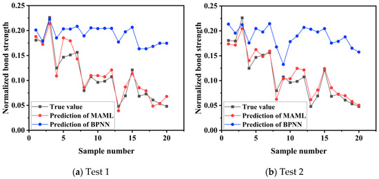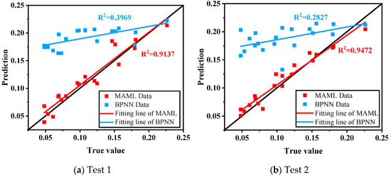 As shown in Figure 3, it can be observed that the predicted results of the BPNN in both tests are significantly higher than the true values. Moreover, after regularization, most of the predicted values of the BPNN are distributed between 0.15 and 0.20. For samples with lower strength, the BPNN does not exhibit satisfactory learning results, indicating that the network’s learning ability is limited and the results are underfitting. The main reason for the underfitting is the low sample size, which is also one of the important limitations of neural network algorithms in practical engineering applications. For the MAML algorithm, which incorporates prior knowledge, as shown by the red line in Figure 3, the predictive results are significantly superior to those of the BPNN algorithm. Moreover, it achieves better fitting results for both larger and smaller values. Figure 4 provides a more intuitive comparison of the fitting capabilities of the two algorithms.