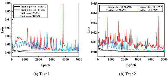 Figure 5 provides a comparative analysis of the training and testing losses of MAML and BPNN across different numbers of repeated tests. Barring the initial phase, MAML consistently exhibits lower training losses than BPNN. The training loss of MAML swiftly approaches zero and steadily converges after a relatively short number of epochs, whereas BPNN’s training loss fluctuates with increasing epochs, displaying a tendency to remain largely unconverged and frequently showcasing outliers. It is not surprising that the BPNN algorithm fails to converge in its prediction on this database. After all, with only around 80 samples, and not all of them being high-quality, the dataset falls far short of the big data requirements of neural network algorithms. On the contrary, both in training and testing, the MAML algorithm converges rapidly on this small sample database.
