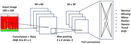 The neural network used for data anomaly detection includes typical convolutional layers. The architecture of the CNN is shown in Figure 1. The first hidden layer is a feature map with a size of 60 × 60, generated after implementing the convolutional layer with 20 filters of a size of 41 × 41 and a stride of one. The third layer is of size 30 × 30, generated after implementing a max pooling layer with a pooling size of 2 × 2 and a stride of two.