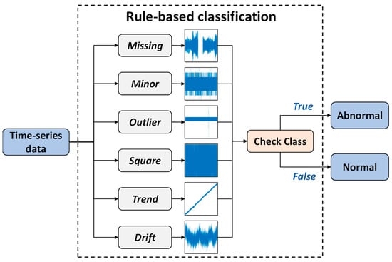 This study introduces a rule-based classification and compares it with the CNN-based classification to investigate the issues of intrinsic class ambiguity and information loss in data-to-image conversion. The overall process of the rule-based classification is shown in Figure 2. Each data anomaly class is defined by specific rules and algorithms that minimize the need for extensive data preprocessing, such as converting data into images. The measured time-history data were scrutinized for each class and classified into a single anomalous class upon detection. If no anomalous classes were found, the data were considered Normal. Note that the time-history data can have multiple classes of data anomalies, except for Normal. Herein, we define the data anomaly classes and provide rules for determining classes.