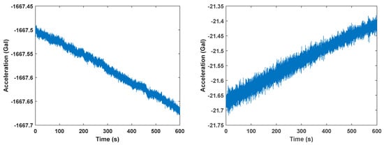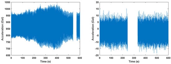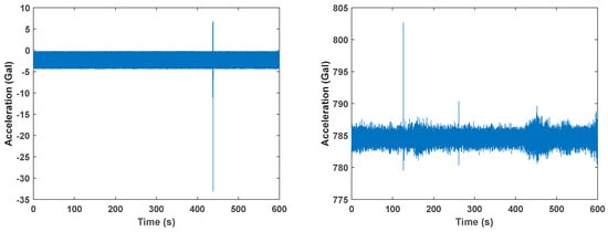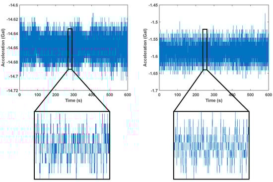 The Minor class indicates data with clear quantization errors that typically occur when the response level is low compared with the resolution of the analog-to-digital converter (ADC), as shown in Figure 4. To detect the Minor class, the number of unique values in the measured structural response was counted. If the number was less than a pre-defined threshold, the data were classified as a Minor class. The threshold can be selected considering that a 24-bit ADC is common in the market.