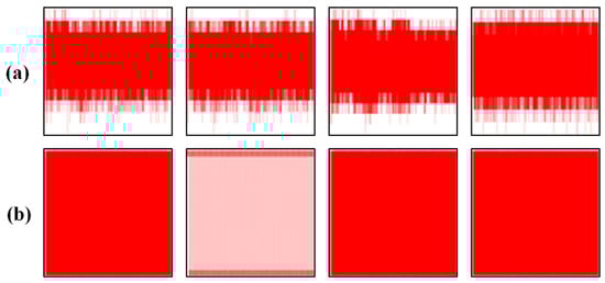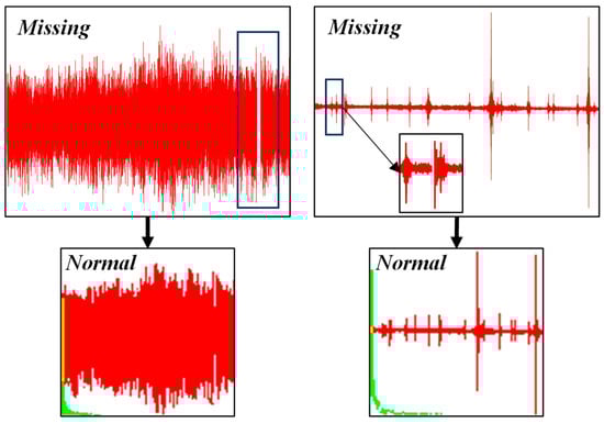 Image conversion also causes information loss on the time axis, which behaves like resampling. In this dataset, one pixel corresponded to 600 data points. Thus, fewer than 600 missing data points could not be included in the converted image. For example, the images at the top of Figure 20 exhibit missing data, whereas the converted images shown at the bottom are classified as Normal.