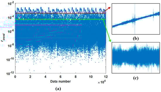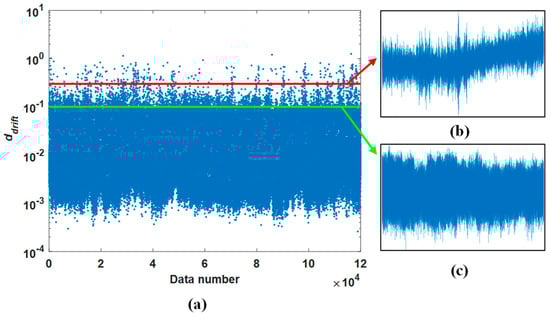 A critical issue in applying a rule-based method is that the measured data have an intrinsic ambiguity in the anomaly classes. In particular, certain data are difficult to identify as the Trend, Drift, or Normal class because the data do not exhibit distinctive features for classification. To better describe the phenomenon, the index defined for the Trend class, rtrend, for all acceleration data is plotted in Figure 12a, showing an almost continuous distribution without clear patterns that can be used for classifying the Trend class. Thus, we selected two threshold values for rtrend to separate data clearly for both Trend and Normal classes, such that data above the red line (i.e., the first threshold of rtrend = 0.00035) and below the green line (i.e., the second threshold of rtrend = 0.00005) in Figure 12b, c are observed as obvious Trend and Normal classes, respectively. The data between the red and green lines are defined as Trend-ambiguous. A procedure similar to that for the ddrift distribution shown in Figure 13a was used for the Drift class. Time history examples for the Drift and Normal classes above and below the green lines are shown in Figure 13b and Figure 13c, respectively. The data between the red and green lines correspond to Drift-ambiguous.