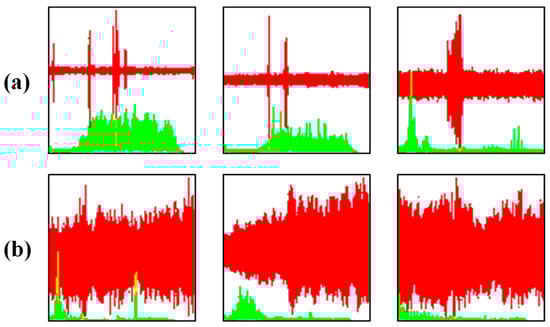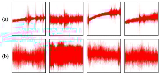 One of the adverse effects of image conversion is the loss of information on the amplitude axis, similar to quantization error. A vertical length of 100 pixels, which is less than 27, is equivalent to applying a 6- or 7-bit ADC to the original acceleration signal. The resulting images after the low-bit ADC are often seen as data of the Minor class, the main reason for which is the quantization phenomenon. Figure 19 shows examples of misclassification (i.e., data in the Normal class were classified as Minor).