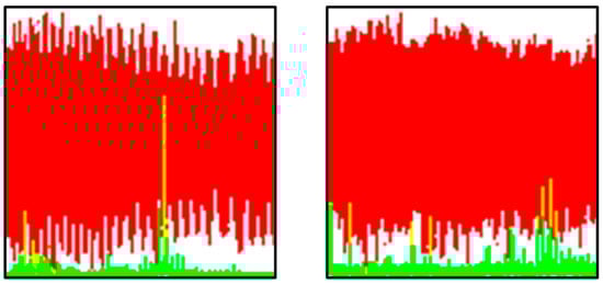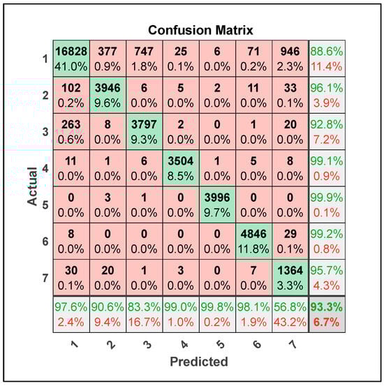 A CNN-based classification method was applied to the prepared labeled datasets. The labeled data must be converted into images for the CNN-based classification. The converted dual-channel images contain time and frequency information in the red and green channels, respectively. Examples of the dual-channel images for all seven classes are shown in Figure 15.