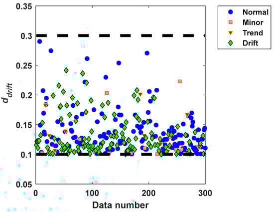 Ambiguous classes were investigated based on the results of the CNN-based classification. Data samples from both Trend-ambiguous and Drift-ambiguous were tested using the trained CNN model. Note that this analysis does not evaluate the performance of the CNN-based classification but discusses the effects of intrinsic ambiguity in the measured data. The classification results for Trend-ambiguous and Drift-ambiguous conditions are shown in Figure 17 and Figure 18, respectively. In the case of Trend-ambiguous, the data were mostly classified into Normal, Trend, and Drift classes. Similarly, in the case of Drift-ambiguous, most of the data were classified into Normal and Drift classes, whereas few were classified into Trend and Minor classes by the trained CNN. These ambiguous classes not only make data labeling difficult but also considerably degrade the classification accuracy of CNN-based methods. Class ambiguity also applies to the rule-based classification. Perfect thresholds that can distinguish ambiguous classes from Normal classes do not exist.