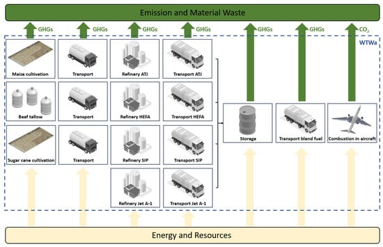 As described in the introduction, SAF stands as one of the pivotal methods for reducing carbon emissions in the aviation industry, albeit typically not achieved by altering fuel composition to lower CO2 generation during combustion. For instance, under comparable conditions, the CO2 emission indices (EI-CO2) for FT fuels derived from natural gas, coal, and JP-8 fuel are 3090, 3110, and 3160 g/kg, respectively, with marginal differences [34]. Conventionally, the comparison of CO2 emissions between SAFs and traditional aviation fuels is based on life cycle analysis (LCA), a method assessing the environmental impacts on human and ecological health caused by a system [35,36]. The system boundary of LCA is depicted in Figure 1, illustrating all inputs and outputs of various fuels (ATJ, HEFA, SIP, Jet A-1) throughout each process or stage in the well-to-wake (WTWa) phase. LCA aims to scientifically and systematically quantify the resource consumption, energy usage, emissions output, and potential ecological impacts of SAFs throughout its entire lifecycle [37]. The lifecycle inventory can be divided into five categories: Firstly, raw material acquisition and processing, which involves recording and quantifying the energy use, water consumption, land use changes, and related GHG emissions associated with the cultivation/collection and preprocessing of raw materials (e.g., plant oils, algae, waste biomass) used in SAF production. Secondly, there is fuel production, which includes analysis of the direct and indirect energy requirements, chemical inputs, and resultant emissions (including but not limited to CO₂, NOx, SOx, and particulate matter) associated with conversion technologies such as hydrotreating and Fischer–Tropsch synthesis/Thirdly, transportation and storage considers the logistics chain from SAF production sites to airports, including the energy consumption and emissions during transportation. Fourthly, there is the usage phase. Although the combustion emissions of SAF in aircraft are typically similar to conventional jet fuel, the net lifecycle emissions can be significantly reduced due to differences in feedstock and production methods. This phase requires the assessment of direct emissions from flight operations. Finally, there is waste management and recycling, which involves analysis of the treatment methods and environmental impacts of byproducts or waste generated after SAF use [38,39].