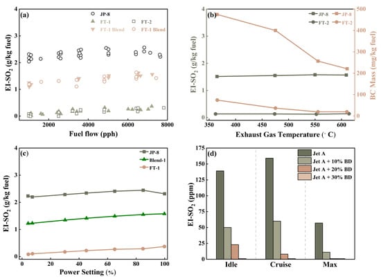 Predictably, the sulfur content in fuel correlates directly with the emissions of SO2 after combustion. In the study by Corporan et al. [98], JP-8 and synthetic jet (synjet) fuel were blended at different volume ratios of 0%, 25%, 50%, and 75%. The mass fraction of sulfur elements in the fuel was 0.06, 0.05, 0.04, and 0.02, respectively. Combustion experiments with the T63 engine showed that the SO2 emissions from the four blending ratios of JP-8/synjet fuel were approximately 34, 23, 15, and 7 ppm, respectively, with equivalence ratios of 1.00, 1.05, and 1.10 exhibiting similar emission quantities and trends. In the Alternative Aviation Fuel Experiment (AAFEX), researchers employed a sulfate particulate analyzer (SPA) in conjunction with a trace-level pulsed fluorescence SO2 analyzer to measure SO2 gas emissions from a DC-8 aircraft equipped with a CFM56 engine. The results indicate that, under APU load, the SO2 emission indices (EI-SO2) for JP-8 were 1.5–1.8 g kg−1, while those for FT-2 were 0.13–0.15, suggesting a 92% reduction in aviation SO2 emissions with SAF use, albeit with minimal differences in CO and NOx emissions, as shown in Figure 4a. The SO2 emissions from a 50:50 volume blend of FT-1 (Shell) and FT-2 (Sasol) fuels were approximately half that of pure JP-8, attributed to the high FSC of JP-8 at around 1200 ppm compared with negligible sulfur in neat FT fuels. Additionally, compared with JP-8, FT-2 exhibited nearly a 100% reduction in EI-particle-bound sulfate emissions and a five-fold reduction in EI-particle-bound organics. As shown in Figure 4b,c, EI-SO2 remained relatively constant with increases in exhaust gas temperature (EGT) and power setting, while black carbon (BC) emissions decreased with rising EGT, with JP-8 exhibiting a greater reduction than FT-2. At varying EGT, the EI-SO2 for FT-2 fuel ranges from 0.12–0.14 g/kg fuel, while for JP-8, it ranges from 1.51–1.58 g/kg fuel. EI-SO2 shows a slight increase with increasing power. The EI-SO2 for blended fuels falls between that of the JP-8 and FT fuels. Figure 4a–c correspond with [34,99,100], respectively. Yakovlieva et al. [101] incorporated fatty acids ethyl esters (FAEE) derived from rapeseed oil (RO) as bio-additives into Jet A-1 fuel at proportions of 10% and 20%. The sulfur contents in Jet A-1 and modified FAEE were 0.025% and 0.0085%, respectively. Traditional aviation fuel and blends containing 10% and 20% modified FAEE generated respective SO2 pollution gases of 0.0367, 0.0158, and 0.0281 kg per landing-take-off (LTO) cycle, indicating that a 10% blend of modified FAEE effectively reduced SO2 emissions by nearly 57% compared with pure Jet A-1. Cican et al. [102] examined the combustion parameters and emission characteristics of Jet A and Jet A/biodiesel (BD) blends in a JETCAT P80 microengine, simulating idle, cruise, and max stages by setting throttle positions at 18.7%, 30%, and 94%, respectively (BD belongs to biofuel rather than SAF, and is here for reference). SO2 was detected using an MRU analyzer with a measurement range of 0–2000 ppm and an accuracy within ±10 ppm or 5% reading. As shown in Figure 4d, the EI-SO2 during the cruise phase was the highest among the three stages, but a 10% BD blend effectively reduced EI-SO2 in the exhaust gases during any stage, with EI-SO2 dropping to approximately 10 ppm when the blend reached 20%. Moreover, increasing the BD content in the fuel also improved thrust by around 5% and reduced EI-NOx by approximately 25%. This suggests that incorporating BD into aviation fuel does not require engine design modifications and does not significantly alter engine performance, making it a promising method for aviation fuel substitution. The sulfur content, methods/burning platform, and instrumentation of standard specification SAF and related fuels are shown in Table 1. According to ASTM specifications, Jet A or Jet A-1, as representative conventional aviation fuels, require sulfur content to be below 3000 ppm, whereas the maximum specification value for sulfur content in the seven ASTM-certified SAFs listed in the table is 15 ppm, with sulfur content in SIP fuel limited to below 2 ppm. Blending SAFs significantly reduces sulfur content in conventional aviation fuels across various tests and decreases SO2 emissions in engine tests, demonstrating the sustainability and environmental friendliness of SAFs.