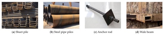 The full recycled support system of steel-pipe-anchored sheet pile consists of various components, including steel sheet piles, steel pipe piles, steel tie rods, and steel waist beams. As depicted in Figure 1, all these elements can be retrieved after the pit is backfilled.