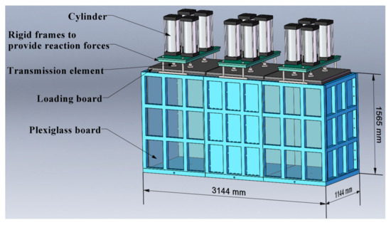 The testing apparatus consists of three main components: the model box, loading system, and monitoring system. The model box has internal dimensions of 3 m in length, 1 m in width, and 1.5 m in height. Plexiglass panels are located on both sides of the front of the model box, allowing for convenient observation of foundation deformation. The loading system includes a cylinder, loading plate, reaction frame, and air compressor, as shown in Figure 3.