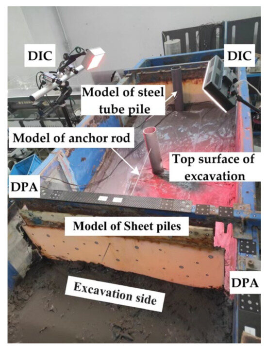 After the model foundation is constructed, manual excavation is conducted within the predetermined layers of the excavation area. The depth of each layer’s excavation is 10 cm, until noticeable deformation, cracking, or damage occurs on the top surface of the foundation pit, or until the excavation depth reaches 50 cm.