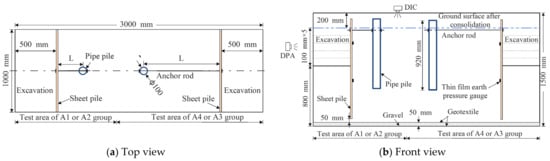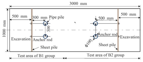 The spacing, referred to as L, between the pipe piles and sheet piles is detailed in Table 1. When a single pipe pile is used, it is positioned along the centerline of the model box’s long axis. In cases where two pipe piles are utilized with a spacing of 300 mm, they are symmetrically arranged on both sides of the long-axis centerline of the model box. To adhere to test boundary conditions and streamline the test procedure, one pit excavation test is conducted at each end of the model box for identical model foundations. Specifically, A1 and A4, A2 and A3, and B1 and B2 represent identical model foundations, with the test arrangement depicted in Figure 5 and Figure 6.