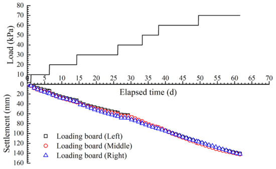 The model foundation is constructed using the consolidation method with step-by-step loading. In this process, the subsequent load is applied after the soil consolidation under the preceding load is completed. The criterion for determining soil consolidation completion is when the vertical deformation rate of the soil body falls below 2 mm/day and the excess pore water pressure is almost dissipated. Based on the in situ soil’s natural density (1850 kg/m3) as the target value, the initial load of 2 kPa followed by subsequent increments of 10 kPa for each step, leading up to the final load of 70 kPa, were determined through preliminary testing.
