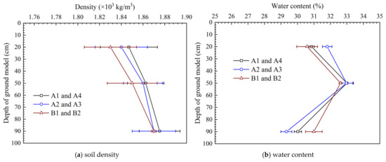 Distribution of (a) soil density and (b) water content along depth in model foundation.